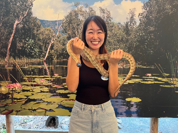 オーストラリア原産のブラックヘッド・パイソンさんとの緊張感あふれる写真撮影!日本語名では、そのままの『黒頭パイソン』。頭の黒い部分だけを巣穴から出して、効率よく日光を吸収しているのだとか!そんな豆知識を聞くと、動物への興味や愛着がより増しますね!