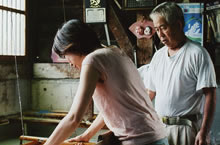 男性は佐々木寛治郎さん。女性は予想通り、佐々木さんの奥さん。私達は作業場に案内された。しっとりとした空気。薄暗いけれど、窓からは優しい光が差し込んでいたのが印象的だった。緊張感と柔らかさが共存している不思議な空間。壁には佐々木さんの手漉き和紙に描かれた絵や書が、たくさん貼られている。全国から送られてくる作品達は、和紙の可能性を広げてくれる個性的な物が多い。そして、佐々木さんが手漉き和紙の卒業証書を棚から取り出した。近くの小学校で使われているらしい。味気ない自分の卒業証書を思い出すと羨ましくなった。 |