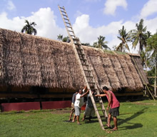 日本が好き、と言ってくれた彼らの期待に、胸をはって応えられるような「つながり」を作りたい。滞在期間も残りわずかになった頃、お世話になった方々への恩返しをはじめた。 まずは、キンロウホウシに参加させていただいた村の人々へ。屋根葺きを手伝ったことが功を奏したのか、本来、女人禁制であるアバイの中で、カメの煮つけをいただくこともあった。夜釣りの船に便乗させてもらい、満点の星空の下、とれたてのシャコ貝をいただいたこともあった。食には食でお返しをと、獲ってもらった魚を使って、ちらし寿司を作ることにした。しかし、日本でも、ろくに魚をさばいたことなどない私たち。ガタイのよい熱帯魚を、悲鳴をあげながら切り刻んだ。悪戦苦闘の末、だいぶ身の量が減ってしまったが、なんとかちらし寿司を飾るお刺身が完成。皆で食べていただくことができた。 たくさんのフルーツを恵んでもらった村では、調査中に発見した「地域の魅力」のフィードバックを行った。パラオの伝統集落では、家々を結ぶ石畳の道がみられる。急なスコールが多く、泥の道はぬかるんでしまうため、石畳が有効に機能するのだ。車道が整備された今日では、多くの場合、主要道ではなくなっていて、藪で覆われていることもしばしばだが、苔むした石は、なんともいえない風情を醸し出すものだった。そこで、私たちが感じた集落の魅力を村人に伝えるとともに、日本にも石畳の道(熊野古道)があり、立派な観光資源になっていることを紹介した。人口流出に悩む村の人々が、少しでも自分の村に誇りをもつきっかけになれば、との思いからだった。その数日後に村を訪れると、今まで気づかなかった場所に、石畳が顔を覗かせているのが目に入った。なんと、村人によるキンロウホウシで、石畳周辺の藪刈りと清掃が行われていたのだ。思いが伝わり、日本とパラオの「つながり」強化の第一歩を踏み出せた気がして、とても誇らしかった。こうして、50日間にわたるパラオ滞在は幕を閉じた。