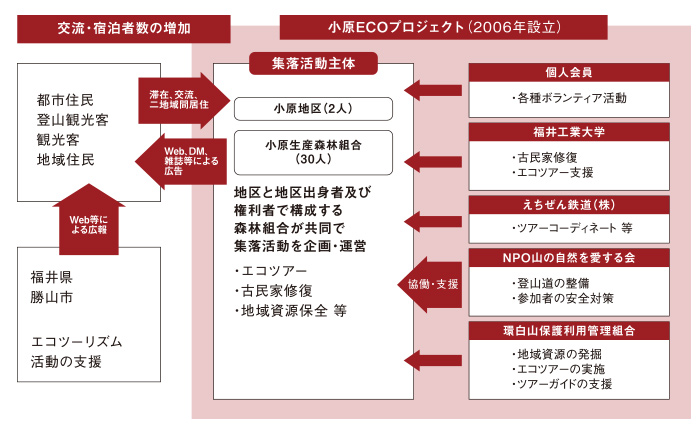 福井県勝山市小原集落は自然に囲まれた限界集落。住民がたった2人というショッキングな状況にもめげず、古民家を修復した農家民宿を交流拠点に、地元大学・周辺住民らと観光振興に取り組んでいる。交流人口年間1200人以上を目標に、農村文化、動植物の生態系、地形などを資源とした多様なエコツアーを提供している。