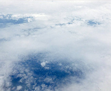 さっそくその窓から外を見ると、いろいろな形の雲が広がっていた。それは、まるでたくさんのわたがしが浮かんでいるような景色だった。空の青と雲の白のコントラストがとてもきれいだ。また、雲の切れ間からは、一面に地図が広がっているような光景が見えた。いつもは山頂から見る景色が、山を登らずに見ることができて、少し得した気分になった。
