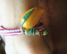 私は説明を聞くと、早速アクセサリーを作り始めた。ところが、アクセサリーをつなぐ金具を輪の形にできない。ペンチが思うように使えないのだ。四苦八苦していると、後ろから細い腕がのびてきて、私のペンチをつかむとあっという間に金具を曲げてきれいな輪にした。驚いて振り返ると、頭にバンダナを巻いた背の高いおばあさんがいて、「早く続きをしなさい」というような身振りをした。私はアクセサリーに金具を通し、それをゴムに通し、ビーズなどで飾り付けをした。「やっとできた」と思って一息ついていると、さっきのおばあさんが私の作品を見に来た。随分まじまじと見ているなあと思って見ると、おばあさんはゆっくりと目を細めてにかっと笑った。その顔を見て、私も思わず笑顔になった。周りで働いている、子どもを連れたお母さんたちも、私の作品ができたのを見て手を叩いて喜んでくれた。アクセサリーができただけでこんなに喜んでくれたので少し恥ずかしかったが、とても嬉しかった。
