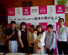 町づくり観光課の係長さんは「まさか本当に来てくださるとは」と目を丸くし、「おーい、みんなで写真撮ろう!」と職員に呼びかけ、『絵本の里けんぶち』という大きな横断幕の前で集合写真を撮ってくれた。