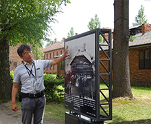 アウシュビッツへは、クラクフからバスで一時間程度。道中、のどかな田園風景が続き、こんな穏やかな所にどうしてこの様な施設があったのだろうと思いながら景色を眺めていると、あっという間に到着した。夏休みシーズンという事もあるのか、様々な国の人々が集まっている。日本人と思われる方々も、ちらほら到着し、十人ぐらいの輪が出来ると、程なく中谷さんがやってきた。この中に入るという現実に緊張する。中谷さんから、見学前のアドバイスを受け、気をひきしめる。沢山の方々が亡くなった場所。粛々とした気持ちで見学しなければ。