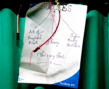 夜はさらに深まる。さっきまで賑やかだった小さな部屋に、ジャクルと私だけが残されていた。しんと静まり返った部屋に雨音がしっとりと響く。銀の皿には、カステラがふた切れ載っていた跡がかすかに残っていた。おもむろにジャクルが口を開く。「俺は銀行員になるのが目標なんだ。そしたら、もっとよい生活ができるし、もっとよい薬も買うことができるしね。いや、今の生活も自分にとっては悪くないよ。地位や権力もないし、金もない。でもとても楽しいし、充実してる。できることなら何も壊したくない。そのままの方がいいことだってあるしね」と言った彼は、壁に貼りついた一枚の紙を指さす。とてもシンプルに彼の目標の縮図が描かれていた(写真)。