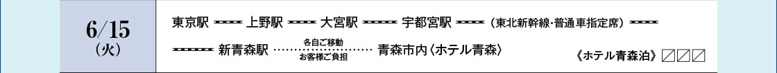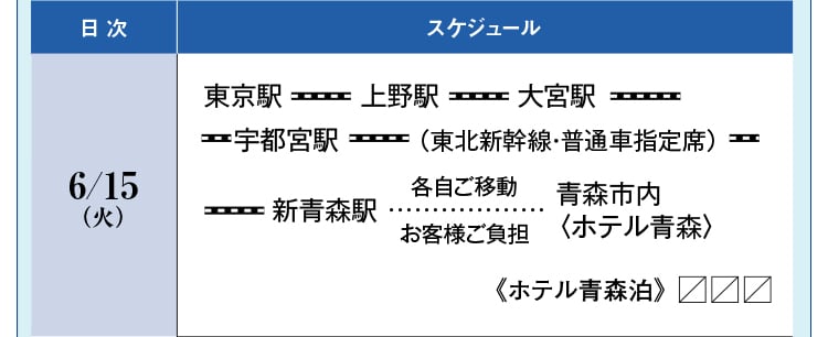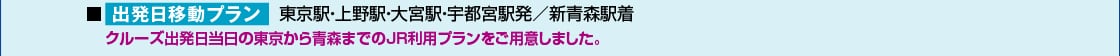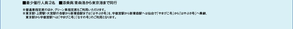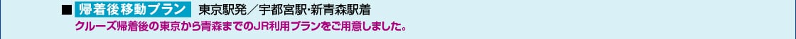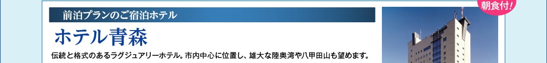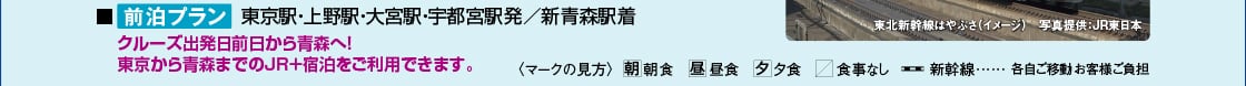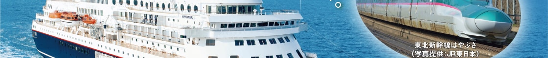 上記のコースに前泊や出発日の移動、帰着後の移動をつけたプランもご用意しました! JR+クルーズプラン クルーズプランと合わせてご利用いただけます。 前泊プラン 東京駅・上野駅・大宮駅・宇都宮駅発/新青森駅着 クルーズ出発日前日から青森へ!東京から青森までのJR+宿泊をご利用できます。 出発日移動プラン 東京駅・上野駅・大宮駅・宇都宮駅発/新青森駅着 クルーズ出発日当日の東京から青森までのJR利用プランをご用意しました。 帰着後移動プラン 東京駅発/宇都宮駅・新青森駅着 クルーズ帰着後の東京から青森までのJR利用プランをご用意しました。 ■最少催行人員:2名 ■添乗員:青森港から東京港まで同行 「日本の旬」「東北デスティネーションキャンペーン」期間中のこの機会に青森を楽しもう! 前泊プランのご宿泊ホテル ホテル青森 伝統と格式のあるラグジュアリーホテル。市内中心に位置し、雄大な陸奥湾や八甲田山も望めます。 ■〈ツイン〉バス・トイレ付(定員2〜3名) ■前泊追加代金