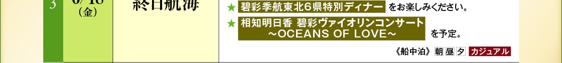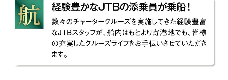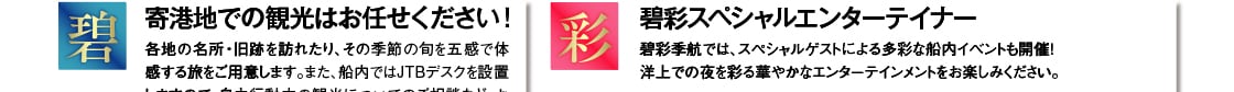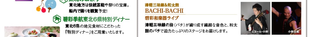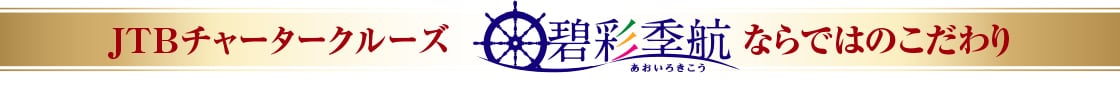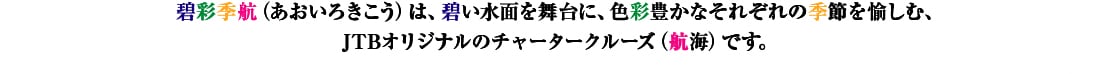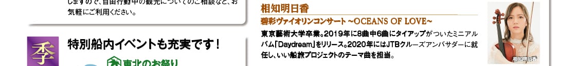 JTBチャータークルーズ 碧彩季航ならではのこだわり 碧彩季航(あおいろきこう)は、碧い水面を舞台に、色彩豊かなそれぞれの季節を愉しむ、JTBオリジナルのチャータークルーズ(航海)です。 寄港地での観光はお任せください! 碧彩スペシャルエンターテイナー 相知明日香 碧彩ヴァイオリンコンサート 〜OCEANS OF LOVE〜 津軽三味線&和太鼓 BACHI-BACHI 碧彩和楽器ライブ 特別船内イベントも充実です! 東北のお祭り・碧彩季航東北6県特別ディナー・東北の地酒・銘菓を味わう 経験豊かなJTBの添乗員が乗船!