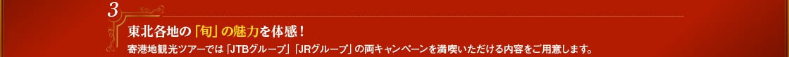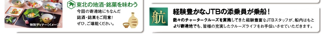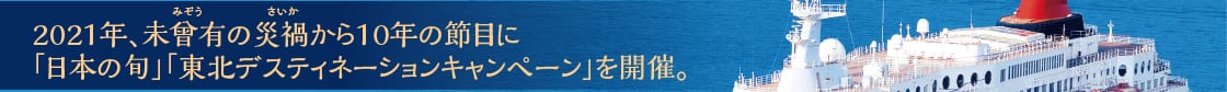 東日本大震災から10年―。自然・歴史・文化・食、魅力あふれる東北へ。 2021年、未曾有の災禍から10年の節目に「日本の旬」「東北デスティネーションキャンペーン」を開催。 JR東日本・JTB・にっぽん丸が初めてのコラボレーション!陸でも、海でも、このクルーズにしかない特別なイベントをご体感ください。