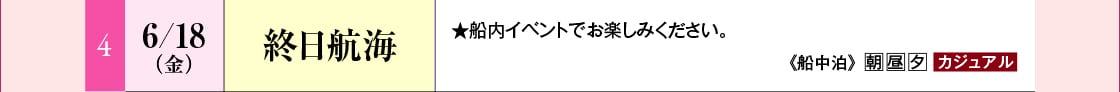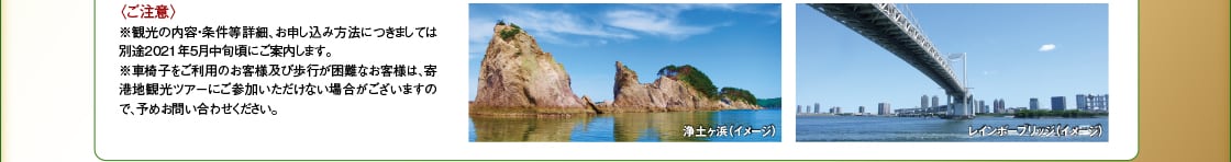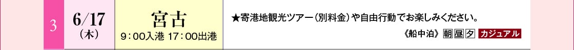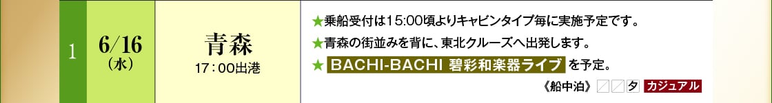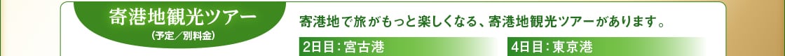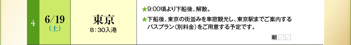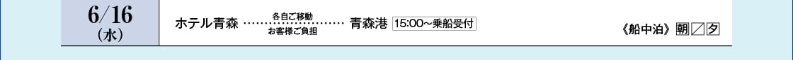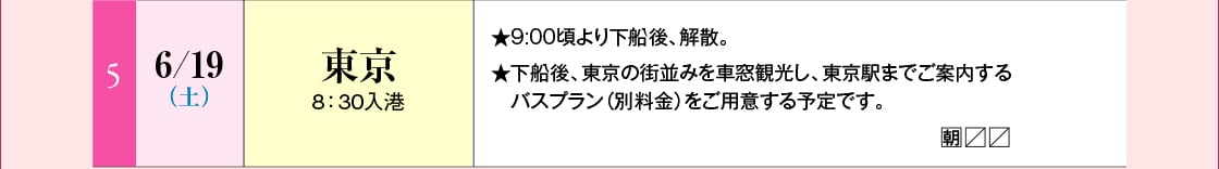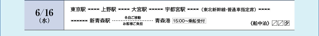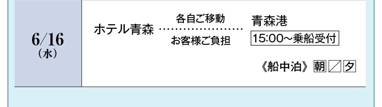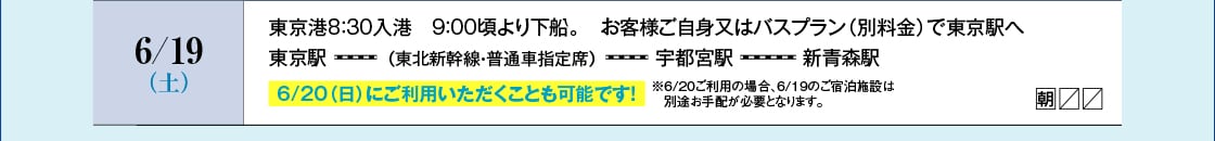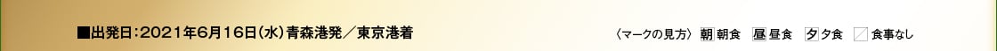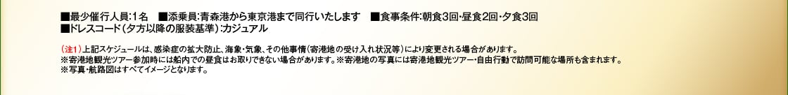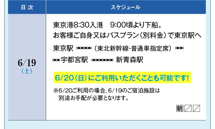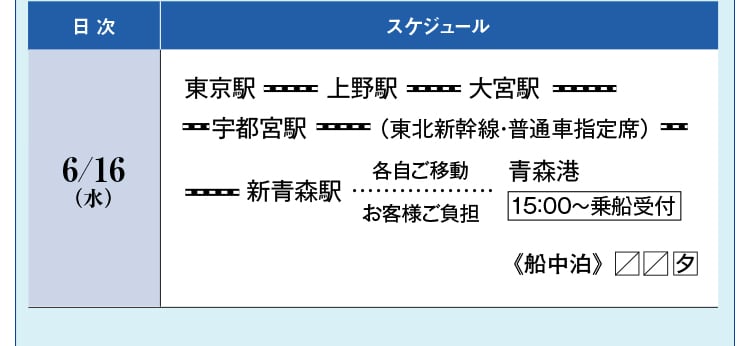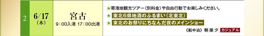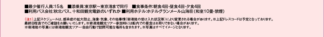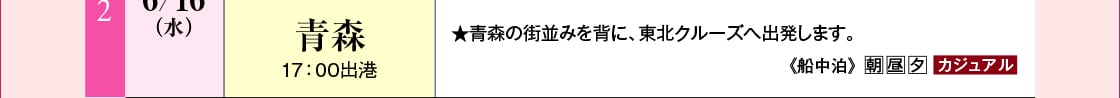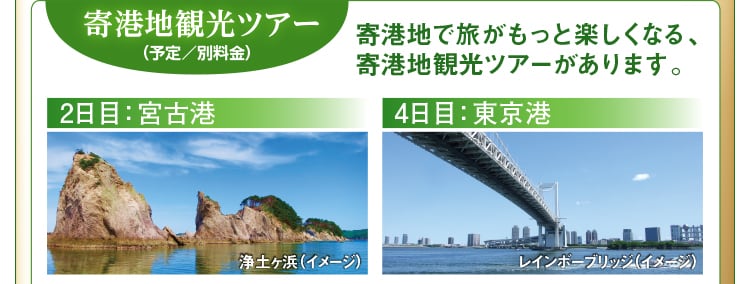 クルーズプラン 青森〜岩手(宮古)〜東京 4日間 ■出発日:2021年6月16日(水)青森港発/東京港着 JR付プラン(出発日移動プラン・帰着後移動プラン)/前泊プランもあります 6/16(水) 青森 17:00出港 6/17(木) 宮古 9:00入港・17:00出港 6/18(金) 終日航海 6/19(土) 東京 8:30入港 ■最少催行人員:1名 ■添乗員:青森港から東京港まで同行いたします ■食事条件:朝食3回・昼食2回・夕食3回 ■ドレスコード(夕方以降の服装基準):カジュアル 寄港地観光ツアー(予定/別料金) 寄港地で旅がもっと楽しくなる、寄港地観光ツアーがあります。