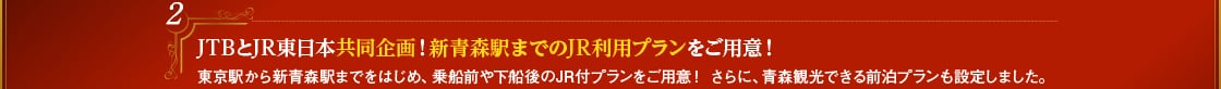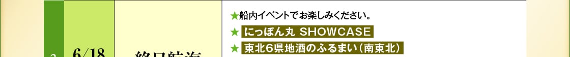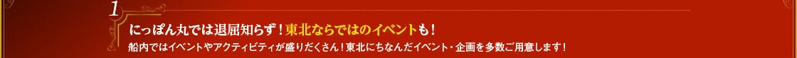 ツアーのポイント にっぽん丸では退屈知らず!東北ならではのイベントも! JTBとJR東日本共同企画!新青森駅までのJR利用プランをご用意! 東北各地の「旬」の魅力を体感! 洋上のリゾート「にっぽん丸」滞在で、移動もらくらく! SDGs(エスディージーズ)を意識した碧彩季航ならではの感染症対策を実施!