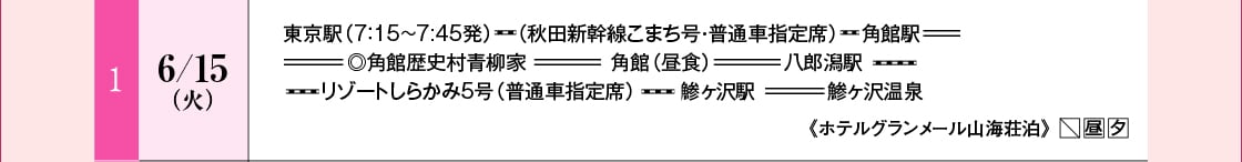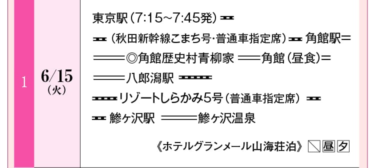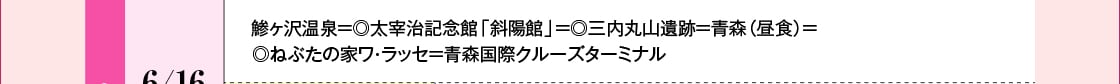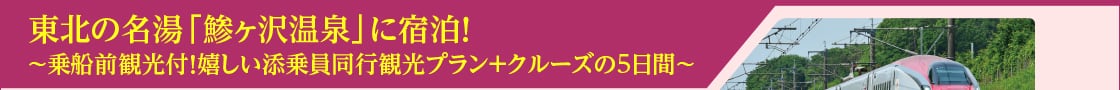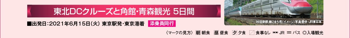 東北の名湯「鯵ヶ沢温泉」に宿泊!〜乗船前観光付!嬉しい添乗員同行観光プラン+クルーズの5日間〜 東北DCクルーズと角館・青森観光 5日間 ■出発日:2021年6月15日(火)東京駅発・東京港着[添乗員同行] 6/16(水) 青森 17:00出港 6/17(木) 宮古 9:00入港 17:00出港 6/18(金) 終日航海 6/19(土) 東京 8:30入港 ■最少催行人員:15名 ■添乗員:東京駅〜東京港まで同行 ■食事条件:朝食4回・昼食4回・夕食4回 ■利用バス会社:秋北バス、十和田観光電鉄のいずれか ■利用ホテル:ホテルグランメール山海荘(和室10畳・禁煙) 三内丸山遺跡(青森県青森市) ねぶたの家 ワ・ラッセ(青森県青森市)