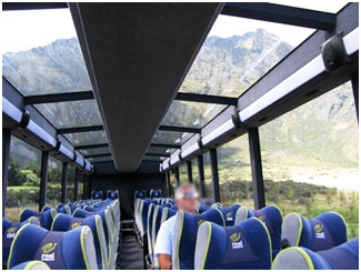 ミルフォードサウンドへは、専用の大型バスで移動します。このバスは一般的な観光バスとは異なり、天井付近まで広がる大きなパノラマウィンドウが特徴です。天井の一部を除き、ほぼ全面がガラス張りのため、晴天の日は真っ青な空と真っ白な雲とともに山々が見渡せ、雨の日は天井のガラスに落ちる雨だれのあとや霧がかった幻想的な風景も存分に楽しめるはず。
