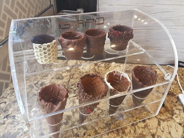 アイスクリームのフレーバーを選んだら、次は器。コーン、紙カップ、揚げパン、ヨークシャープディング(デニッシュ)から選びます。また、コーンと言っても、一般的なシンプルなコーン以外に色々なアレンジでチョコレートがコーティングされたものが数種類あります。