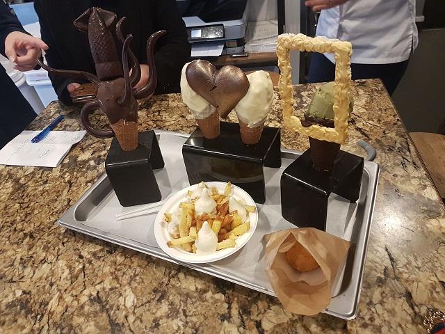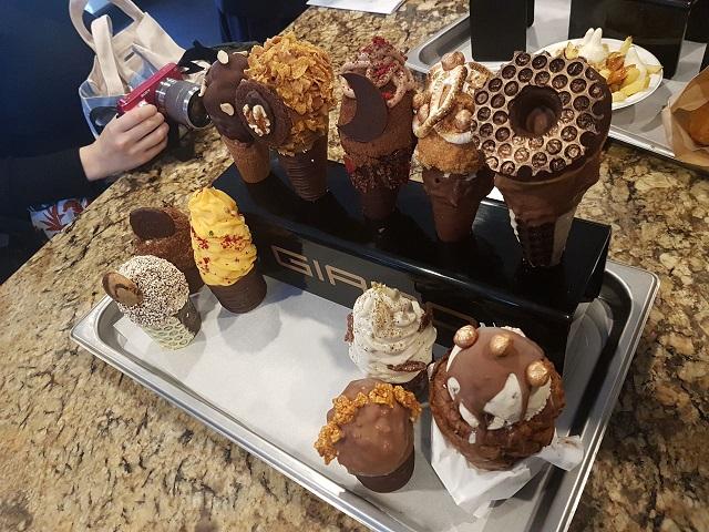 ドーナツ、セルフィ―の額縁付き、イカの頭と足付き、ハートやくちびるの形をしたチョコレートなど、とにかくユニーク!!こんなアイスクリームショップは初めてでした。