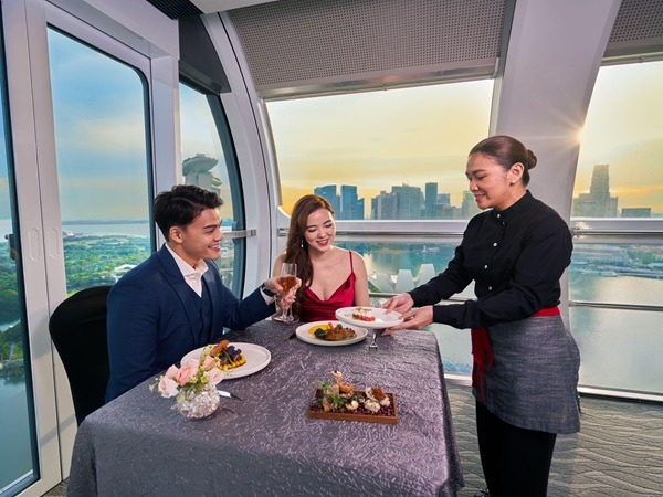 シンガポール・フライヤーでは、カプセル内で食事もできます!カプセルで夕食を楽しんだり、シャンパンやシンガポールスリングを飲みながらのフライトも。夕食が楽しめる「165 スカイ・ダイニング バイ シンガポールフライヤー」。大観覧車で3周する間に夜景を眺めつつ、ダイニングテーブルで食す4コースのメニュー(メイン料理を選択)に舌鼓。ロマンティックな夜を演出してくれるはず。
