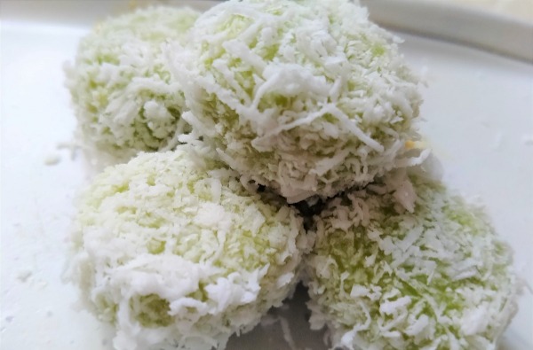 “オンデ・オンデ”というパームシュガーシロップ(黒蜜)入りのココナッツをまぶしたお餅。