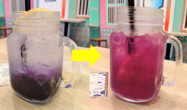 実際レモン汁を少し入れてみると…とても美しい紫色に変化!面白いですね。