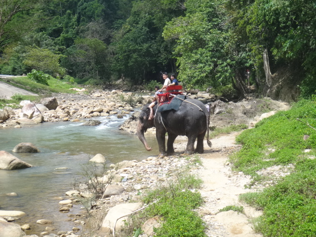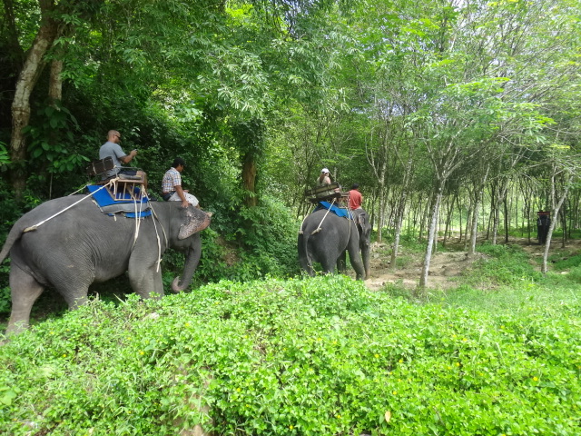 プーケット島でもさまざまなエレファント・トレッキングを楽しめますが、パンガー県での楽しみは、何と言っても、うっそうとしたジャングルと木々の中を流れる川辺の魅力。日本ではほとんど見られないゴム林の中を進み、川に沿って踏み固められた散策路をのんびり歩きます。時には象がざぶざぶと川の中に入っていくかもしれませんが、それも楽しいアクシデントです。