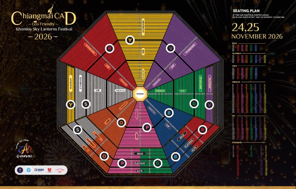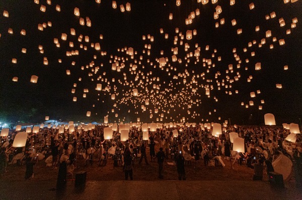 大仏塔のライトアップや花火の演出もあり特に人気の会場「CADカルチャーセンター」。 ランタンを空に放つだけでなく、タイ北部の伝統料理や灯篭流しもお楽しみいただけます。 お席に限りがありますので、お申込みはお早めに!