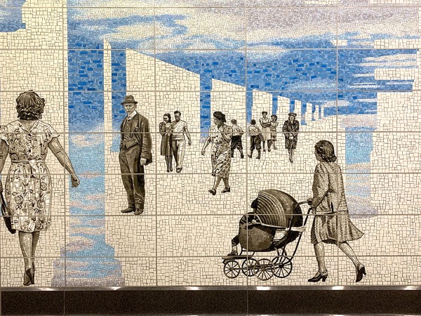 Qラインの63th Street駅はジーン・シンの“Elevated”。1940年代に廃止された2番街高架線の様子が描かれた作品。New York Historical SocietyとNew York Transit Museumに保存されている当時の写真を元にしています。服装や髪型、ベビーカーからその頃の様子が伺えますね。72th Street駅に描かれている現在のニューヨークとは対照的。モザイクアートでも全部テイストが違っていておもしろいですね!