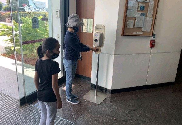 ターミナル入り口にはハンドサニタイザーが常備されています
