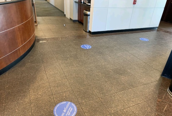 人が並ぶ場所には、写真のように間隔を示すステッカーが貼られています。今では良く見られる光景です。