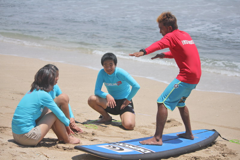 初心者の方にはサーフィンの基本であるテイクオフ(サーフボードに立つこと)を1日でマスターできることが目標。利用するサーフボードはより安全なソフトボードを使用。インストラクターは日本語で指導いたします。