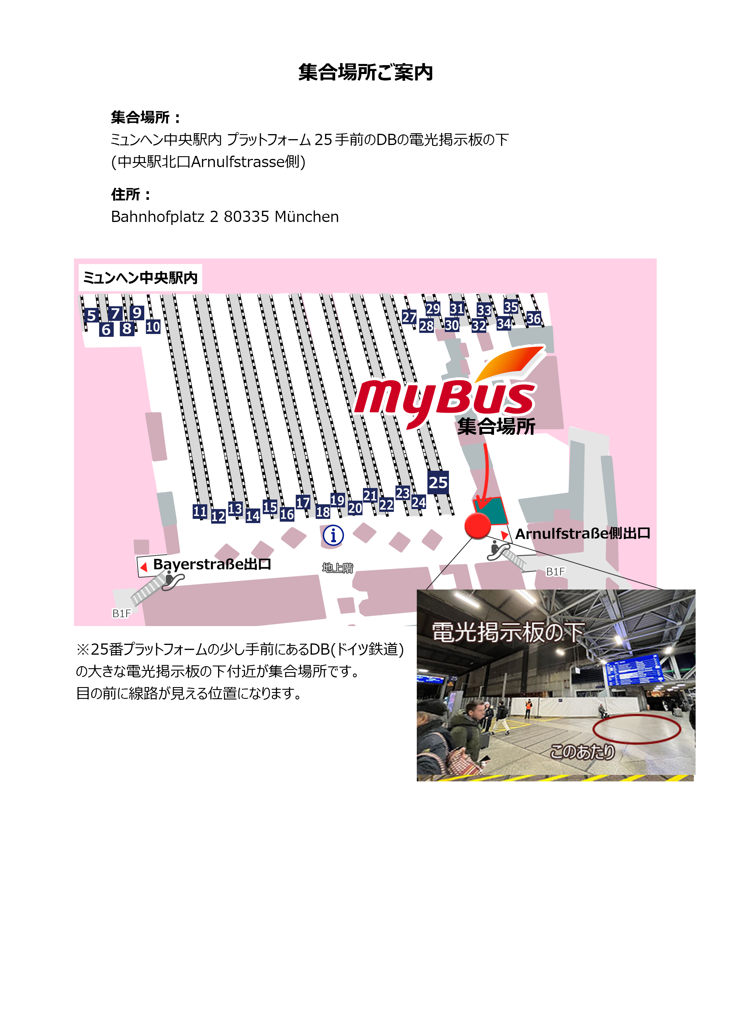 25番プラットフォームの少し手前にあるDB(ドイツ鉄道)の大きな電光掲示板の下付近が集合場所です。 目の前に線路が見える位置になります。中央駅北口Arnulfstrasse側です。