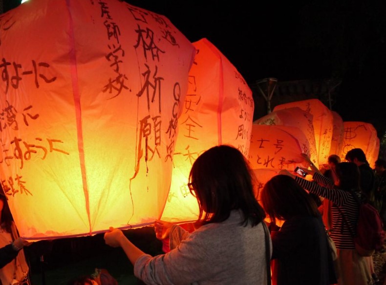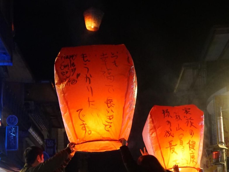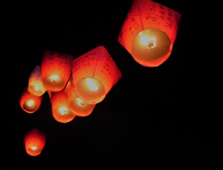 十分にて天燈上げ ※願いを込めて天燈を上げましょう!夜空にランタンが吸い込まれていくさまはなんとも感動的。 |