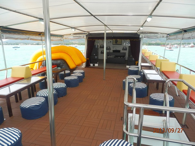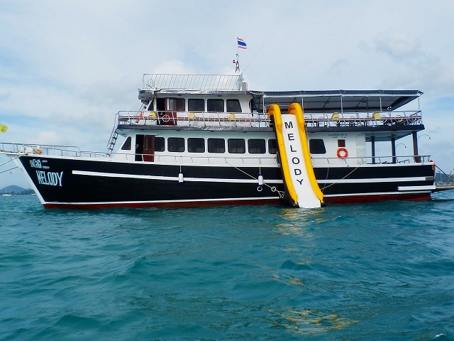 最大収容人数100名の「メロディ号」に乗船して、コーラル島又はラチャ島へ貸切クルーズの旅をお楽しみいただきます。船は3層からなり、サンデッキ、ディスコゾーンとエアコン完備のVIPゾーンに分かれています。6メートルのファン・ウォータースライダーで自由に遊べるのが大きな特徴です。