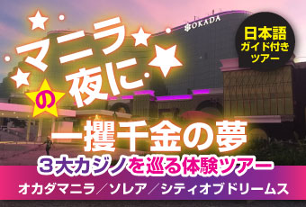 話題のオカダ・マニラを含む、3大カジノを巡るツアー。初めての方でも安心してご参加頂ける日本語ガイド付きツアーです。マニラの夜に一攫千金の夢はいかがでしょうか・・・