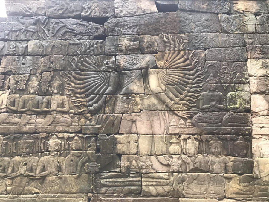 バンテアイチュマールを特に有名にしているのが、回廊に彫られた、千手観音のような観世音菩薩の像。22手を持つこの菩薩は、風雨にさらされながらも鮮明に残されていて、その美しい姿には思わず目を奪われてしまいますよ!