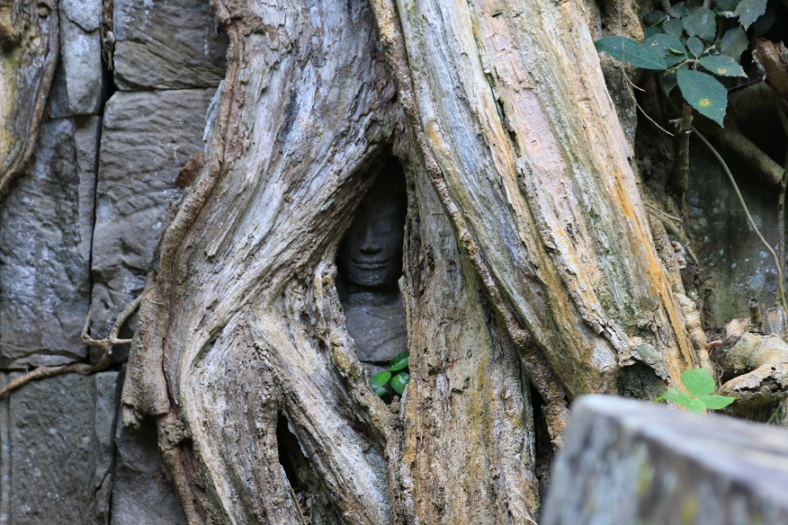 長い間ジャングルの中で放置されていたせいか、巨大な榕樹(カンボジア語でスポアン。ガジュマルの一種)が遺跡に絡み付き得もいわれぬ神秘の世界を創りだしています。その姿は熱帯樹の強い破壊力を実感させられるとともに廃墟と化した遺跡に新しい命を吹き込むようにも見えます。
