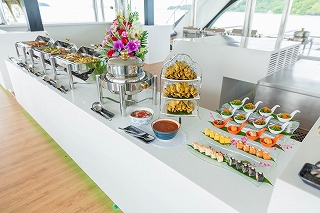 優雅に豪華カタマラン船で絶景のパンガー湾観光。ブッフェの昼食とチキンステーキの夕食付。教育されたスタッフのサービスと清潔な船内設備。充実したツアープラン。ゆっくりめの午前出発。