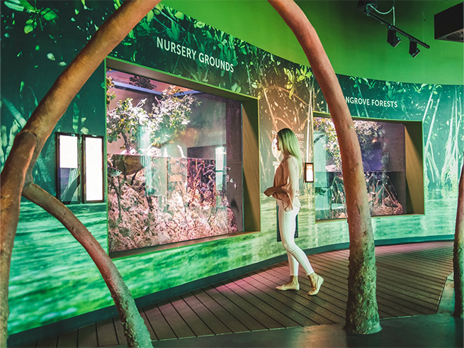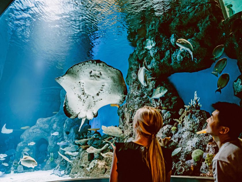 館内にはグレートバリアリーフやマングローブ、熱帯雨林の生態系を再現した展示があり、約15,000種以上の生き物を間近で観察できます🔎