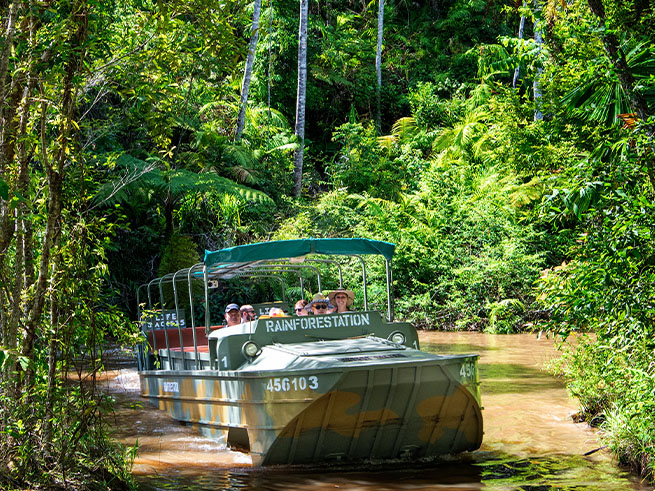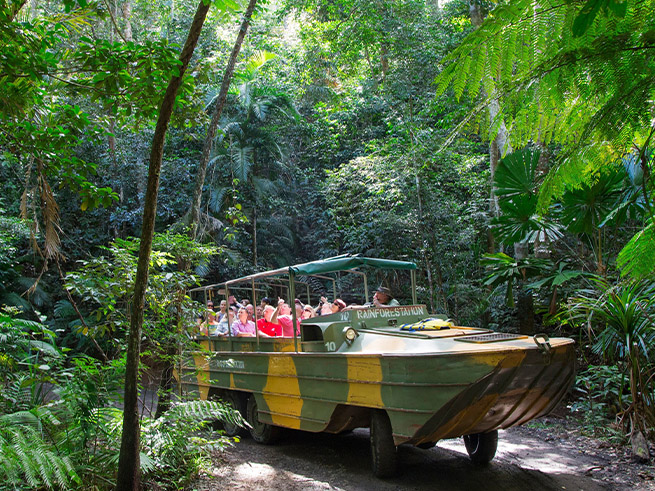 | 料金に含まれるサービス | 日本語ガイドまたは日本語ドライバーガイド、キュランダ鉄道片道料金、昼食(ハンバーガーもしくはフィッシュアンドチップスから選択)、アーミーダック乗車料、お好みチョイス(動物園/パマギリアボリジナルダンス見学*いずれか一つ) |