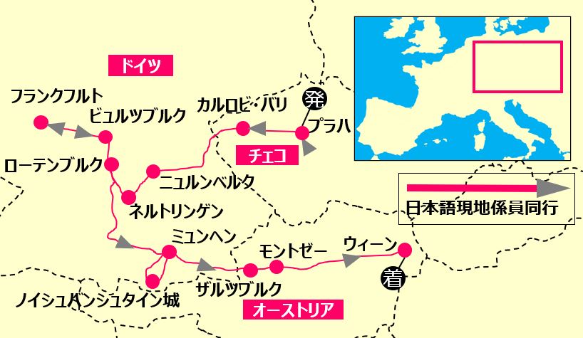 訪問は、プラハ、ニュルンベルク、フランクフルト、ローテンブルク、ミュンヘン、ノイシュバンシュタン城、ザルツブルク、ウィーン、世界遺産を含むチェコ・ドイツ・オーストリア観光満喫ランドクルーズ。1名催行、日本語係員同行。