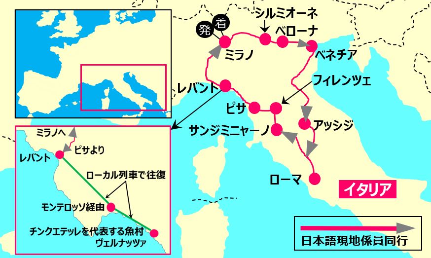 訪問は、ミラノ/ドゥオモ、ベネチア/ゴンドラ遊覧、ローマ、バチカン、フィレンツェ/ウフィッツィ美術館、ピサの斜塔、チンクエ・テッレ、世界遺産を含むイタリア観光満喫ランドクルーズ。1名催行、日本語係員同行。