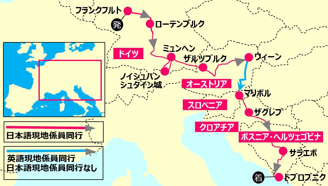 訪問は、フランクフルト、ローテンブルク、ノイシュバンシュタン城、ウィーン、ザグレブ、サラエボ、ドブロブニク、世界遺産も含むドイツ・オーストリア・バルカン半島観光ランドクルーズ。英語バス区間あり。1名催行、日本語係員同行。