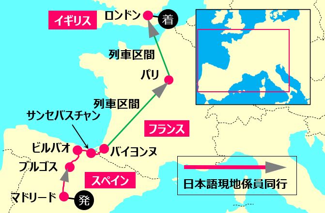訪問は、マドリード/プラド美術館、ビルバオ/ビスカヤ橋、サンセバスチャン、オンダリビア、バイヨンヌ、パリ、ロンドン、世界遺産を含むスペイン・パリ・ロンドン観光満喫ランドクルーズ。1名催行、日本語係員同行。