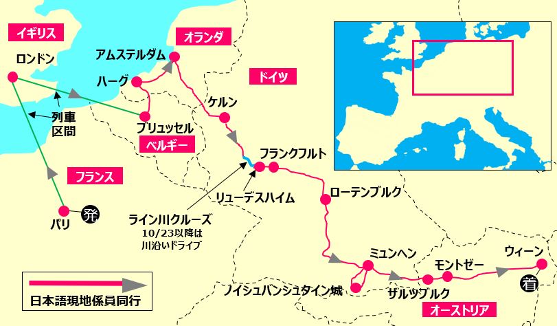 訪問は、パリ、ロンドン、アムステルダム、フランクフルト、ノイシュバンシュタン城、ウィーン、世界遺産と列車の旅、パリ・ロンドン・ベルギー・オランダ・ドイツ・オーストリア観光ランドクルーズ。1名催行、日本語係員同行。