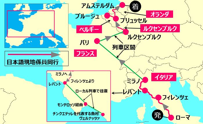 訪問は、ローマ、バチカン、フィレンツェ、ピサの斜塔、ミラノ、パリ、ルクセンブルク、ブルージュ、ブリュッセル、アムステルダム、世界遺産を含む観光とイタリア・パリ・ベネルクス3国周遊ランドクルーズ。1名催行、日本語係員同行。
