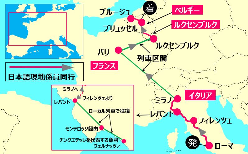 訪問は、ローマ、バチカン、フィレンツェ、ピサの斜塔、ミラノ、パリ、ルクセンブルク、ブルージュ、ブリュッセル、世界遺産を含む観光とイタリア・パリ・ルクセンブルク、ベルギー周遊ランドクルーズ。1名催行、日本語係員同行。