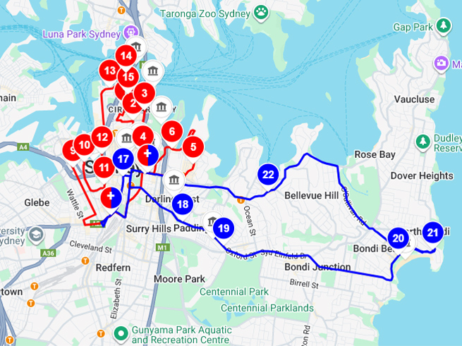 シドニー東部郊外(ボンダイビーチやダブルベイなどの高級住宅街エリア)…ブルールート
