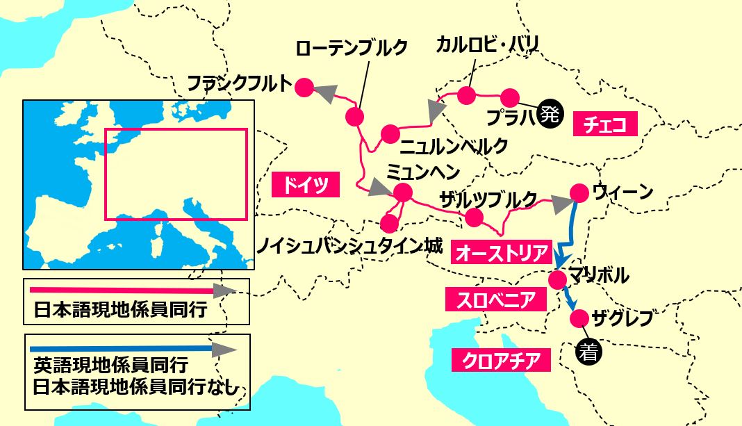 訪問はプラハ、ニュルンベルク、ローテンブルク、ミュンヘン、ノイシュバンシュタイン城、ヴィース教会、ザルツブルク/モーツァルトの生家、ウィーン、ザグレブ。世界遺産を含む中欧、ドイツ、バルカン半島周遊。現地発着ランドクルーズ。1名催行、日本語係員同行。