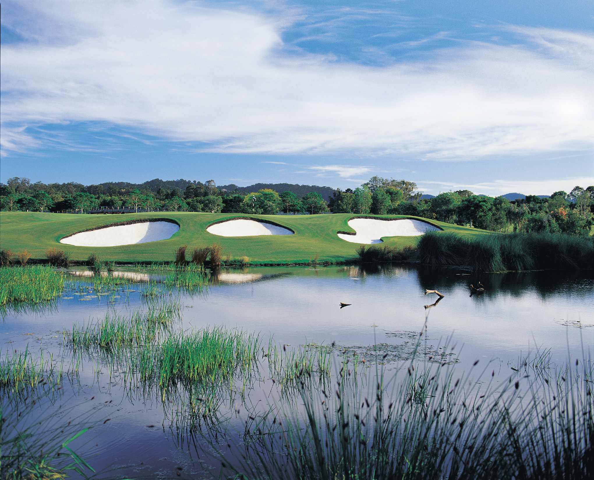 グレッグ・ノーマン設計のチャンピオンコースです。ゴルフ場が入る65ヘクタールの広大なエリアは湿地帯で、カモやシラサギなど野鳥の宝庫。ラウンド中はヒンターランドの山々の景色を堪能しながら、のどかな雰囲気の中でプレイを楽しんでください。コースは、リンクスを思わせるアゴが高いバンカーがフェアウェイの要所にあり、難度が高いドライバーショットが求められるホールが多いです。グリーンは、ゴールドコーストで数少ないベントグリーンを使用、適度なアンジュレーションでベントグリーンならではのボールの転がりを楽しめます。
