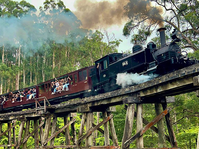メルボルン郊外の美しいダンデノン丘陵を走る人気観光列車「パッフィンビリー鉄道」に乗って、のどかな森の風景を満喫🚂