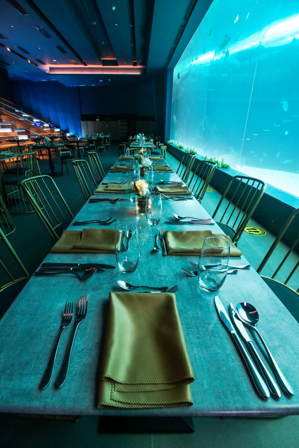 巨大水槽の前に設置されたダイニングスペースでお食事を楽しむスタイルなので、ロマンチックな雰囲気で、思い出に残るひとときを過ごせます。