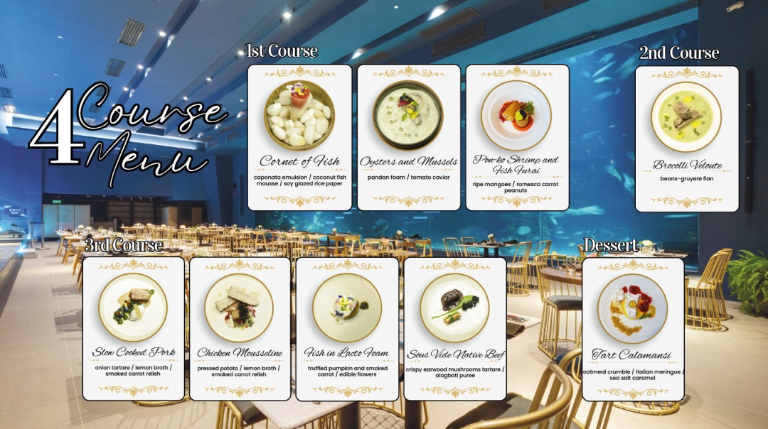 Aqua Dining(アクアダイニング)は、セブ・オーシャンパーク内にある、水槽に囲まれた幻想的な空間でディナーが楽しめるアクアリウム・レストランです。まるで海の中にいるような雰囲気の中、色とりどりの魚たちが優雅に泳ぐ姿を眺めながら、洗練されたフレンチフュージョン料理を味わえます。幻想的な水中の世界で、美味しい料理とともに、忘れられない夜をお過ごしください!