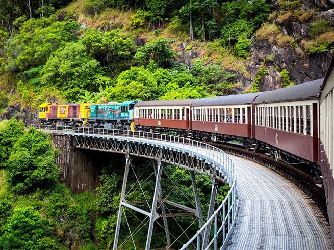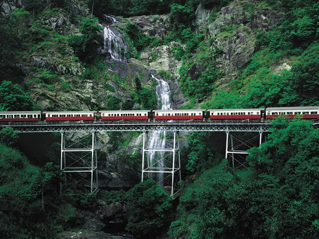 ~ケアンズ 早朝:ケアンズ着 着後ホテルへ(各自でタクシーもしくはUBERなどで) ご到着後はカフェやホテル内レストランにて各自でご朝食をおとりください。 09:00~:熱帯雨林の中を走るキュランダ高原列車にてキュランダへ(約1.5時間) キュランダではマーケット散策や、レインフォレステーションでの水陸両用車乗車、コアラも見れる! オーストラリアならではの動物見学か、アボリジナルの人々のダンスショーのいずれかを現地でお選びお楽しみいただけます。 復路は熱帯雨林を空中散歩!スカイレールに乗車します。 夕刻:ホテル帰着 夜:ディナーは海沿いのレストランダンディーズにてオージービーフを石焼にてお楽しみください。 【ホテル】Crystalbrook Flynn |